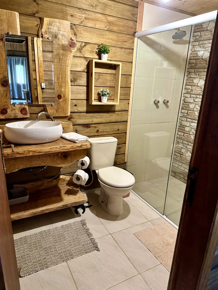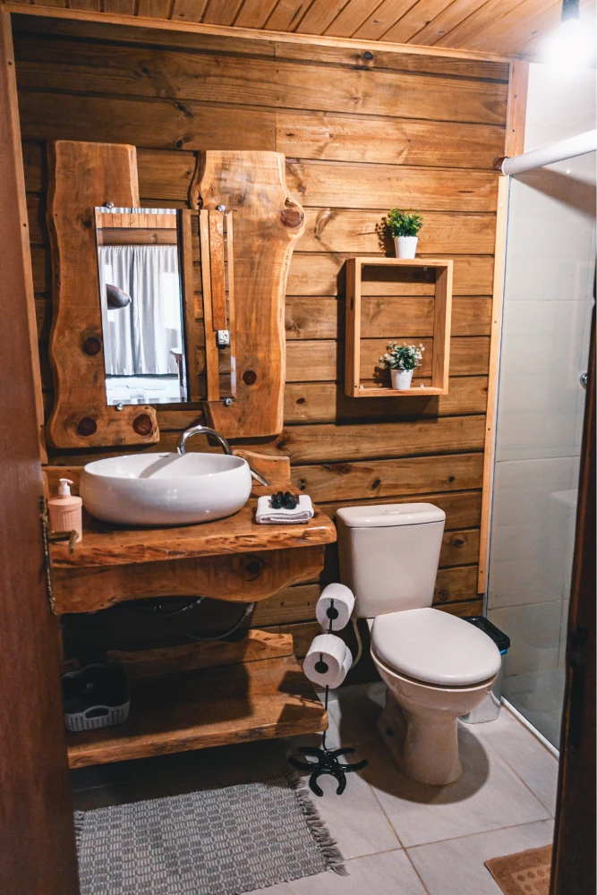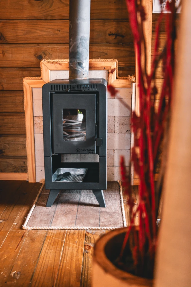 O aquecimento a gás oferece água quente no chuveiro e nas torneiras, enquanto a lareira à lenha (ou calefador) torna o ambiente ainda mais aconchegante.