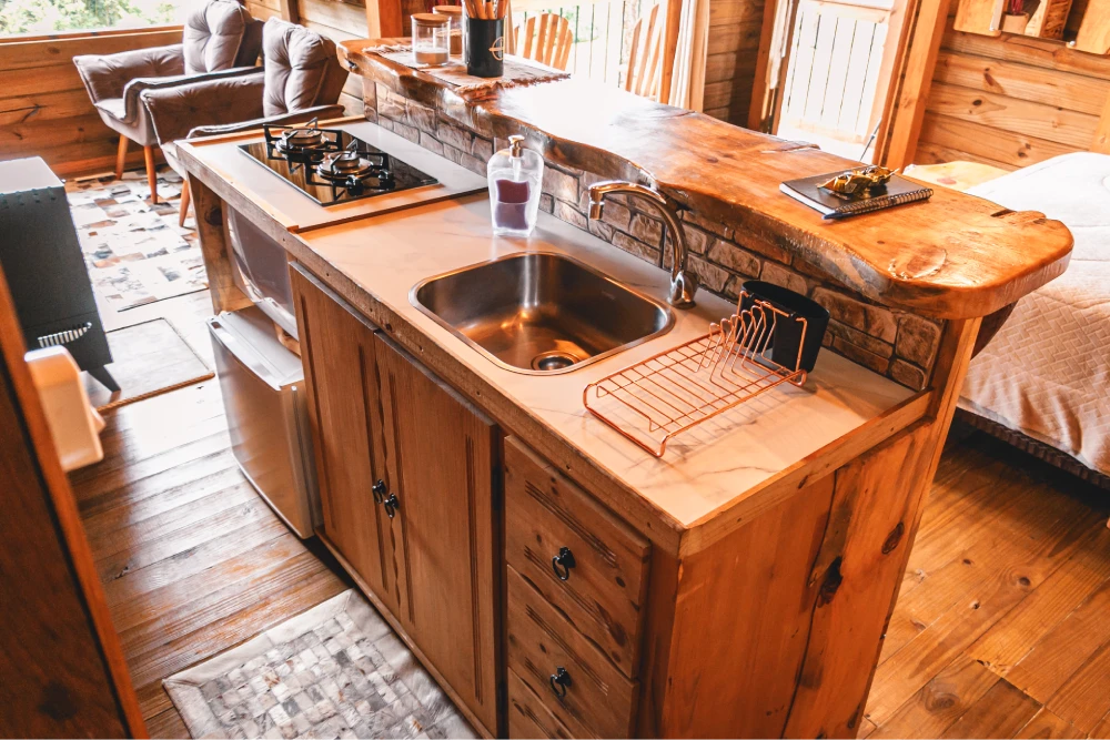 A cozinha compacta é equipada com frigobar 65L, cooktop e utensílios básicos, ideal para preparar pequenas refeições com praticidade.